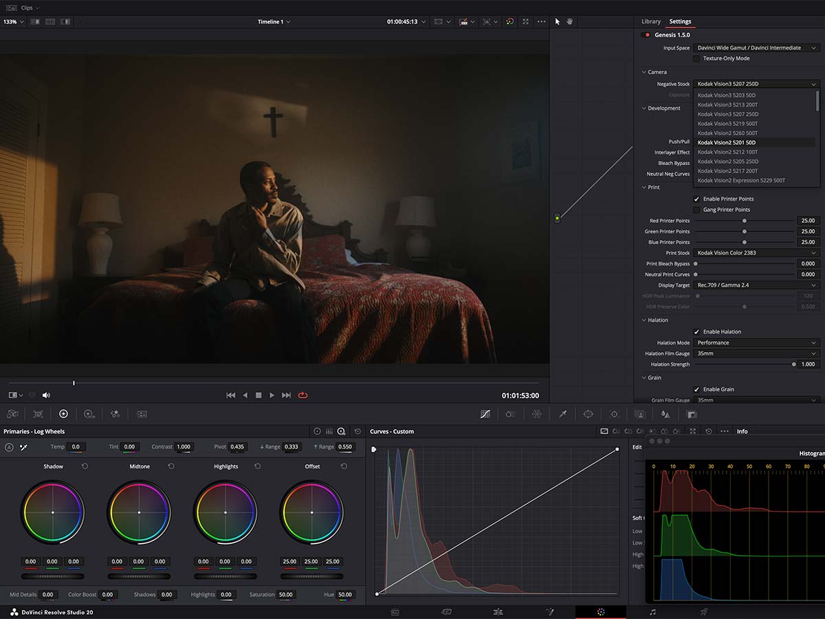 Grain is the most obvious "tell" in digital film looks - get it wrong and the whole image feels fake. Genesis's grain algorithm was obsessively modeled by Steve Yedlin, ASC to match the tonal distribution, shape, size, and rhythm of physical film grain. It's been used on films including Star Wars: The Last Jedi, Looper, Knives Out, and Wake Up, Dead Man.